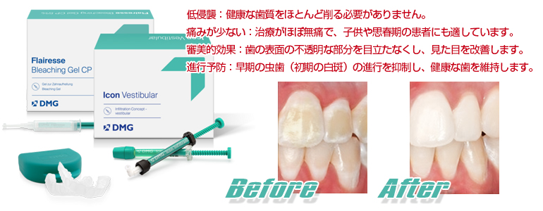 ※Icon Vestibular(アイコン ヴェスチブラ)は、歯の表面にできる「白斑(ホワイトスポット)」を治療するための低侵襲な方法です。歯を削ることなく、専用の薬剤(レジン)を浸透させて硬化させることで、光の屈折率を周囲の健康な歯質と近づけ、白濁を目立たなくする治療法です。虫歯による白斑、エナメル質形成不全(MIH)、フッ素症、外傷後の白濁などが適応となります。